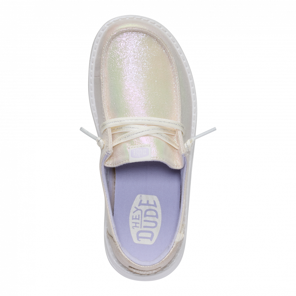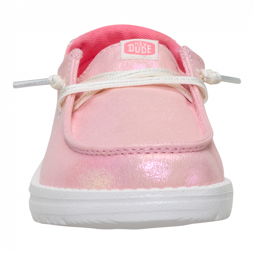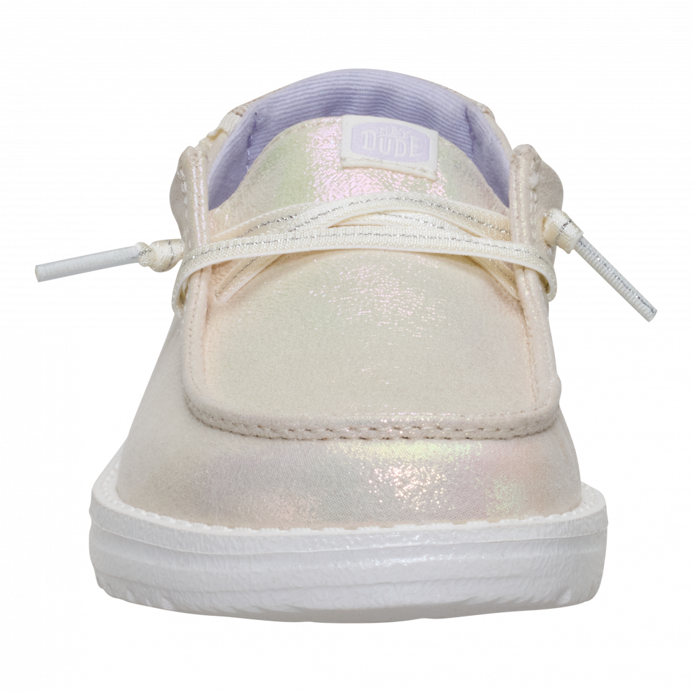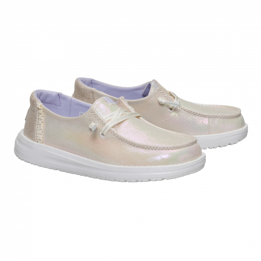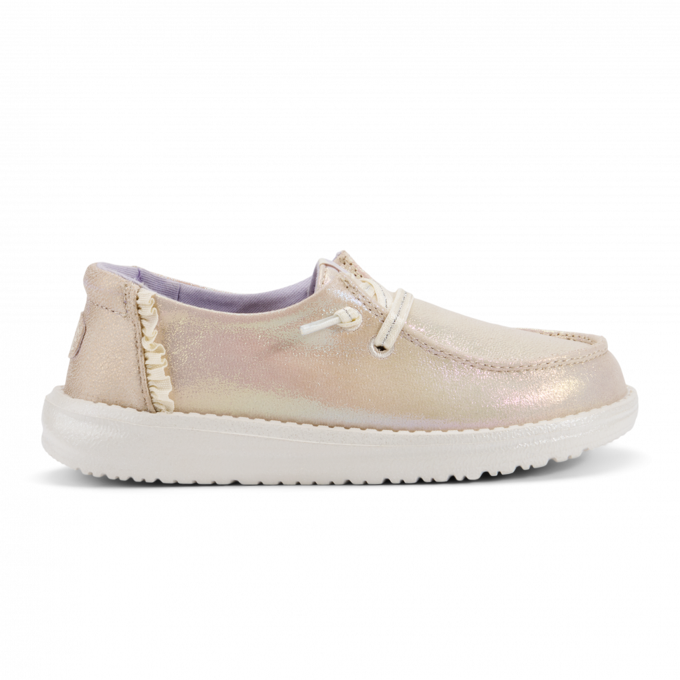 These glittering Wendy shoes for older children can brighten up any day. They catch the eye with a shiny, fabric shell, decorated with playful, soft details. The easy-on style comes with a broad collar that can be stepped into, and stretchy laces that dont require tying. Lightweight, flexible, and comfortable, theyre perfect for a day filled with play.