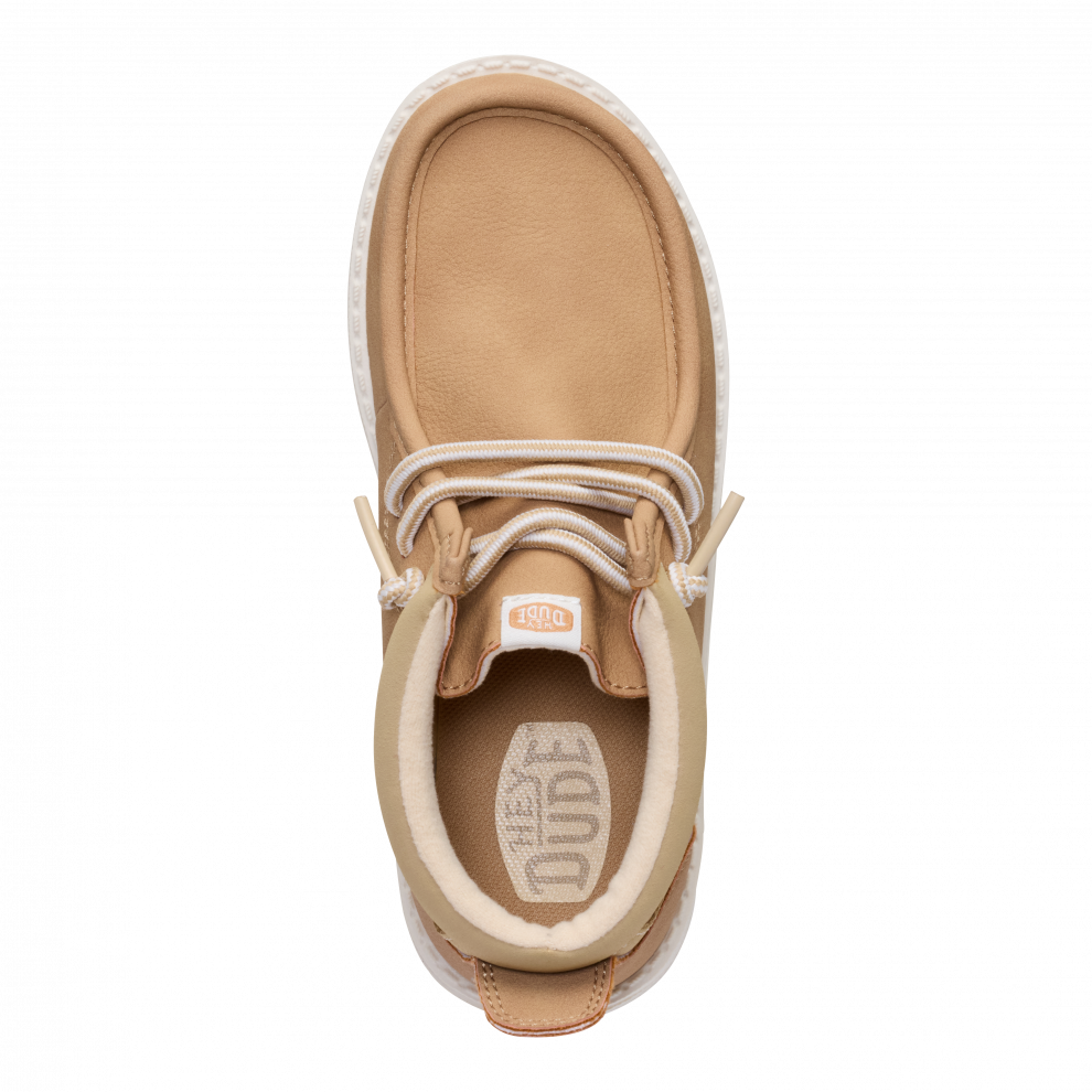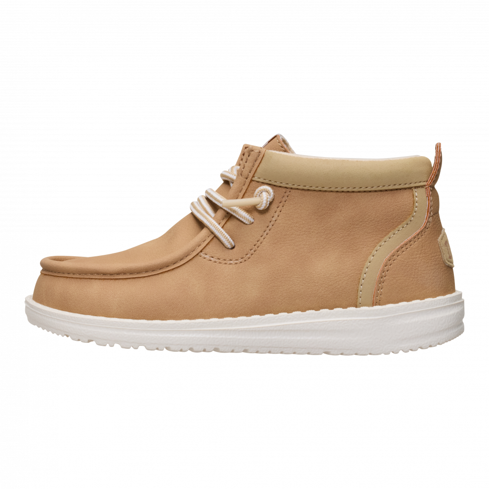 For fashion-conscious kids who dont need bells and whistles to express themselves, these Wally Mid shoes are the tops. Made from clean, classic materials in a neutral shade that goes with anything, they hit slightly higher up the ankle but are still super easy to step into. Signature HEYDUDE™ elastic laces dont need tying to keep the fit snug.