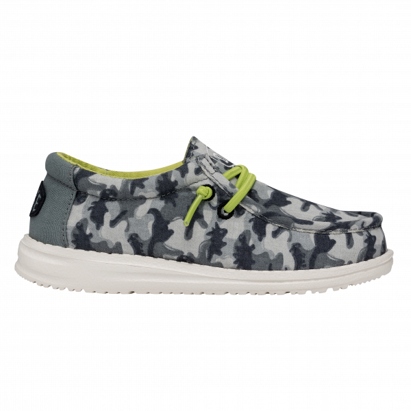 Its Camo-saurus Rex, otherwise known as the Wally Youth Camodino. The cotton-canvas upper keeps feet cool and airy throughout, but stands up to recess and a machine wash. Finished off on an ultralight outsole with no-tie, elastic laces and an extra-cushy foot bed, perfect for playtime, prehistoric-style. These apex predators are comfy from the savannahs to the schoolyard.