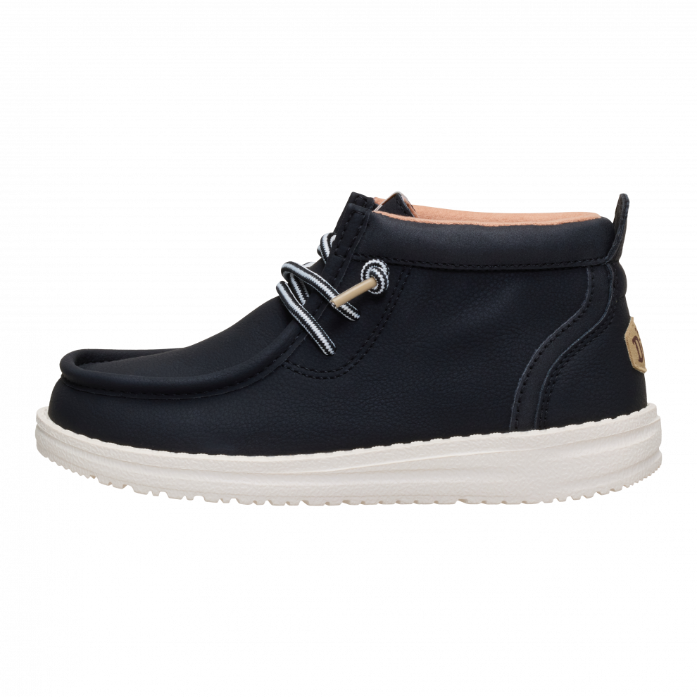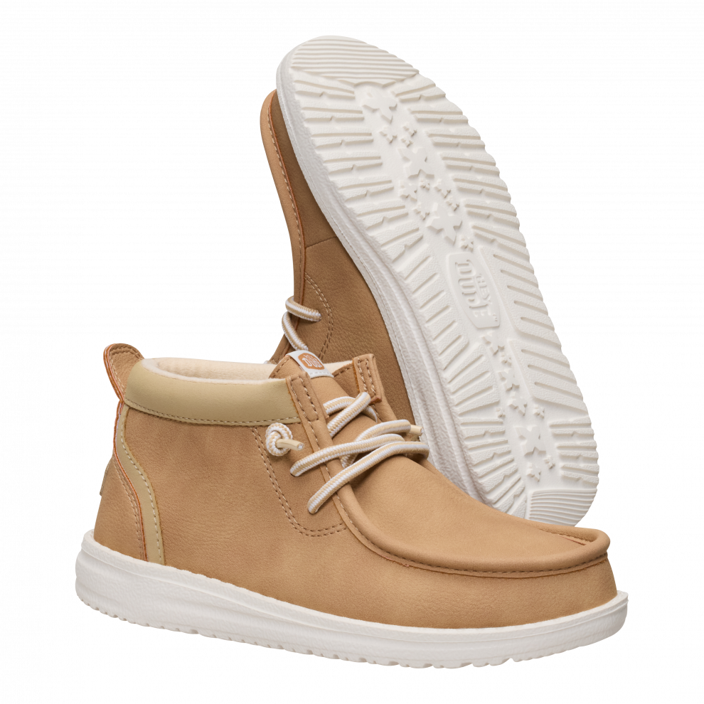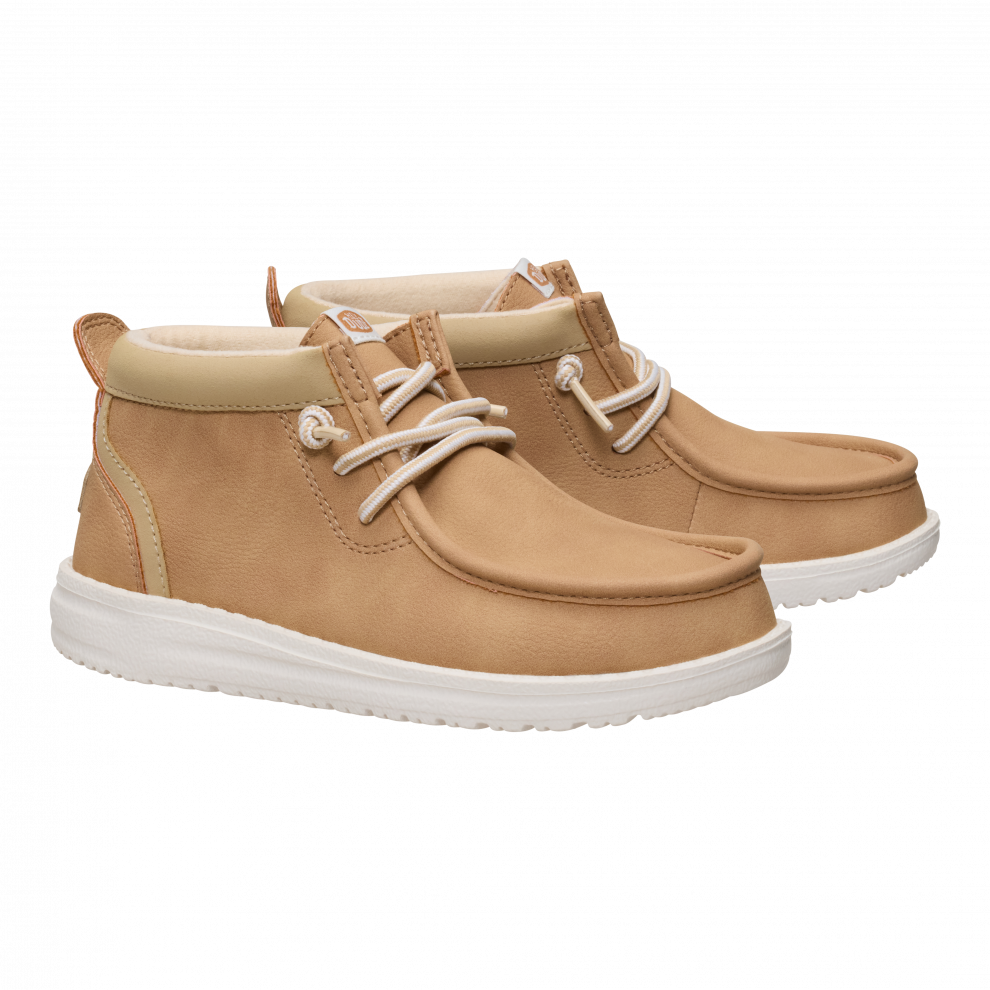 For fashion-conscious kids who dont need bells and whistles to express themselves, these Wally Mid shoes are the tops. Made from clean, classic materials in a neutral shade that goes with anything, they hit slightly higher up the ankle but are still super easy to step into. Signature HEYDUDE™ elastic laces dont need tying to keep the fit snug.